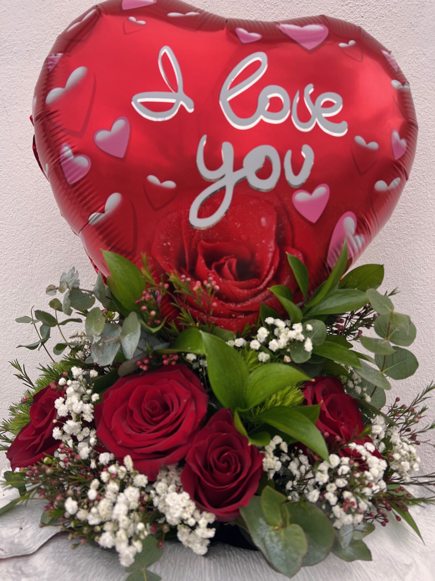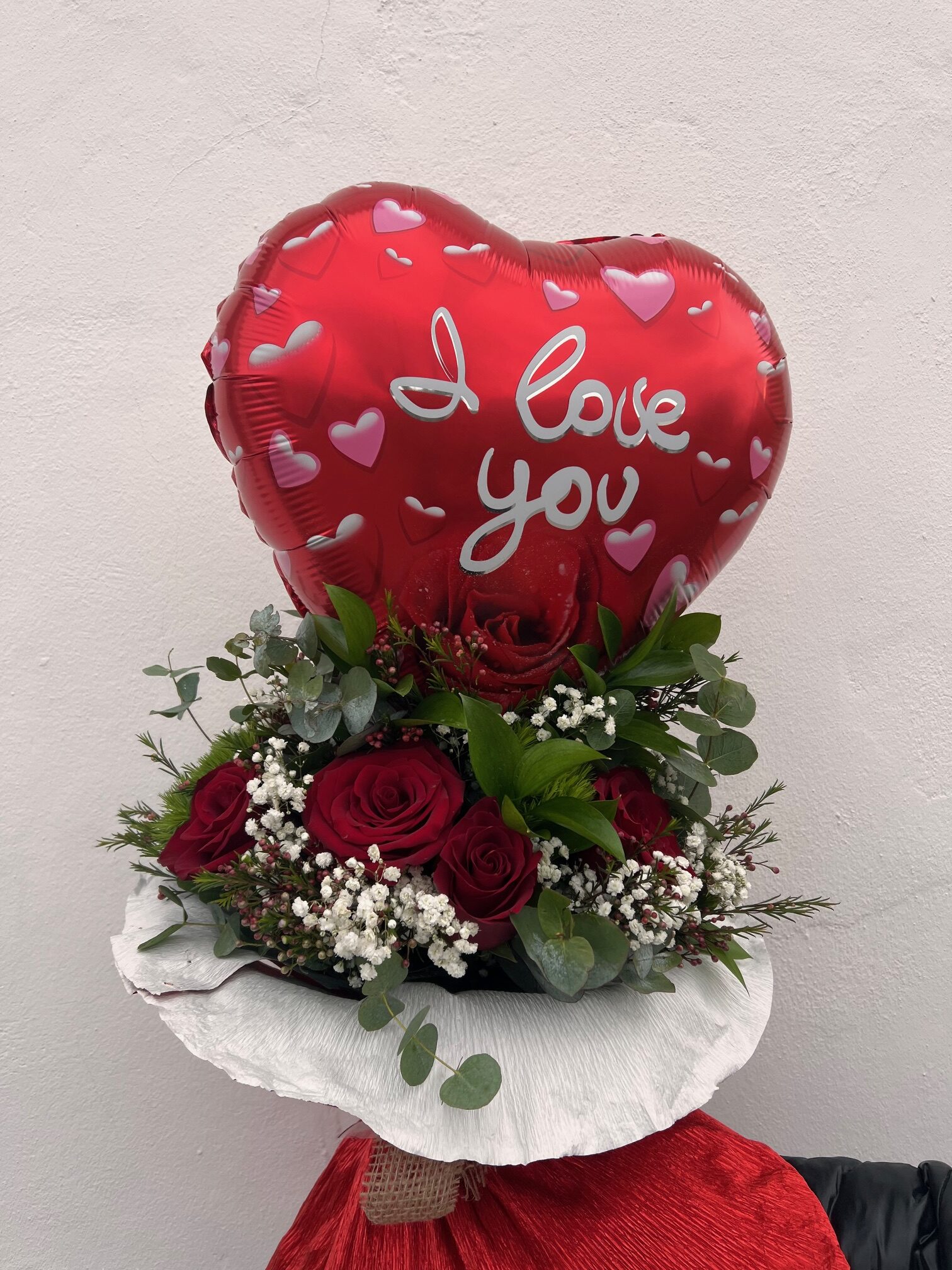 Ramo Globo y rosas rojas: 7 rosas rojas, paniculata , eucalipto cinerea , variedad de verdes y globo 45cms