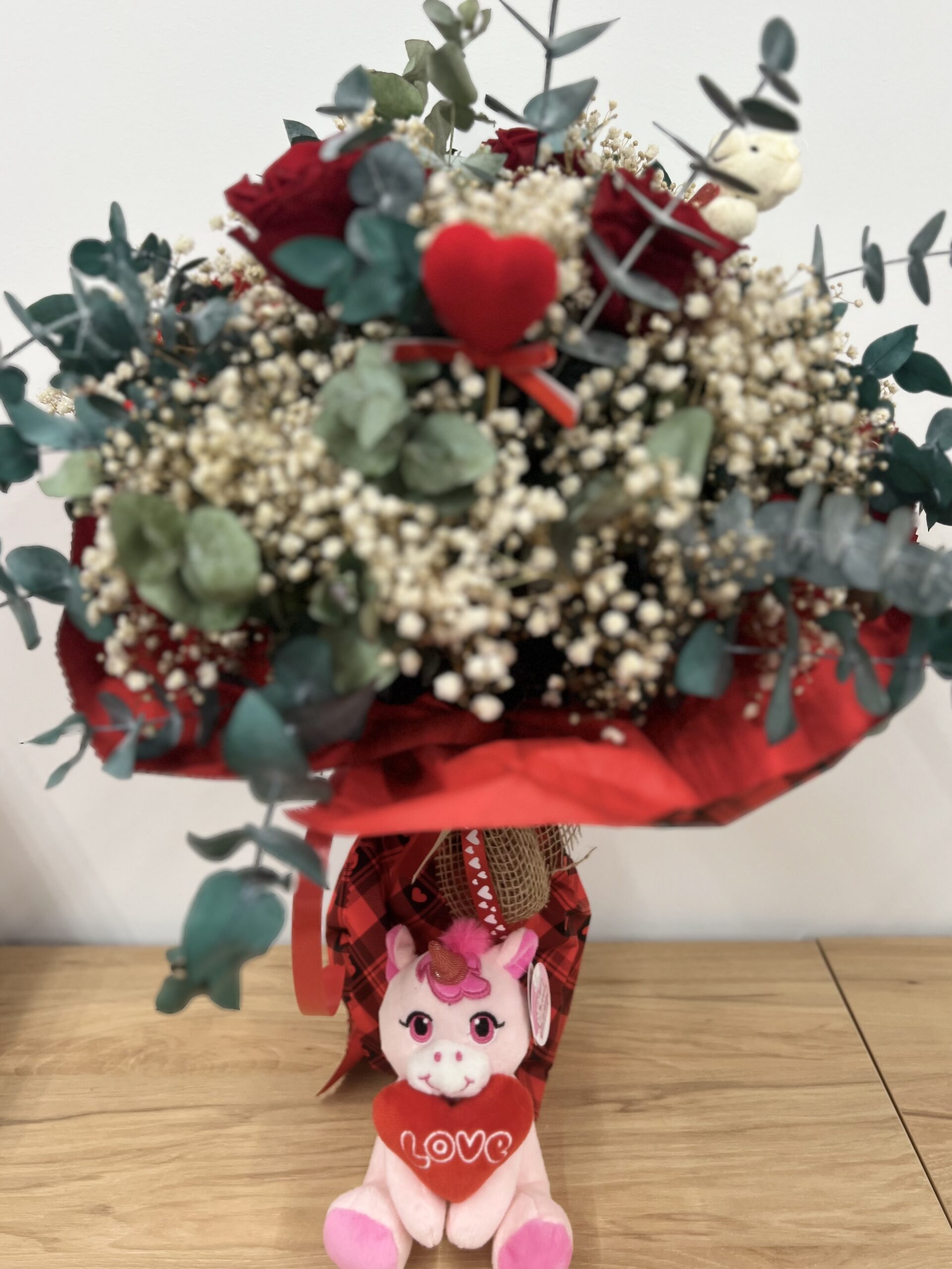 Ramo larga duración : 3 rosas rojas , paniculata blanca , eucalipto natural, pin de corazón y peluche 5cms (Todo preservado)