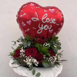 Ramo Globo y rosas rojas: 7 rosas rojas, paniculata , eucalipto cinerea , variedad de verdes y globo 45cms 50,00€