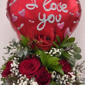 Ramo con 6 rosas rojas , liliums, cimbidium, hiperico rojo, baby green, eucalipto cinerea y verdes.(colores a elegir según disponibilidad).